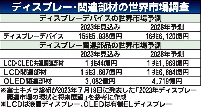 富士キメラ総研(田中一志社長、東京都中央区)がまとめた「ディスプレイ関連市場の現状と将来展望」によるとディスプレーデバイスの世界市場は2023年に15兆5838億円(見込み)、28年には16兆6120億円と着実に拡大する。車載向けディスプ...