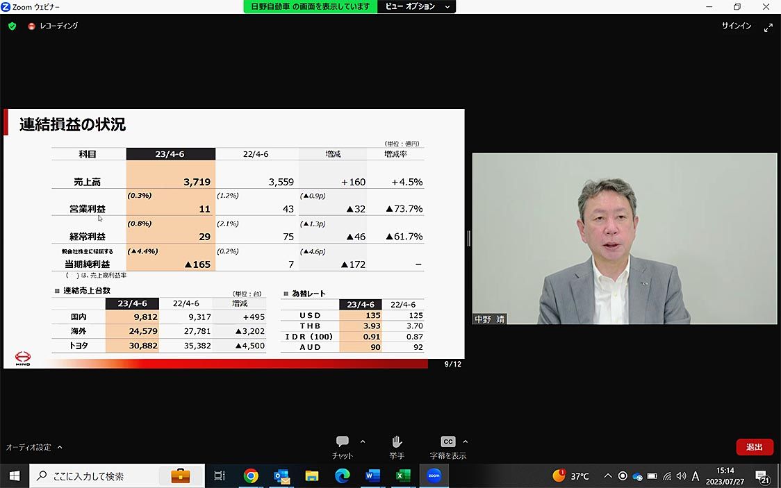 日野自動車は27日、2023年4~6月期決算の説明会をオンラインで開いた。主な質疑応答は次の通り。 ―販売台数は減少し、当期純損益も赤字だが、今期見通しを据え置いた理由は 中野靖・最高財務責任者(CFO)「低調な滑り出しになったという認識...