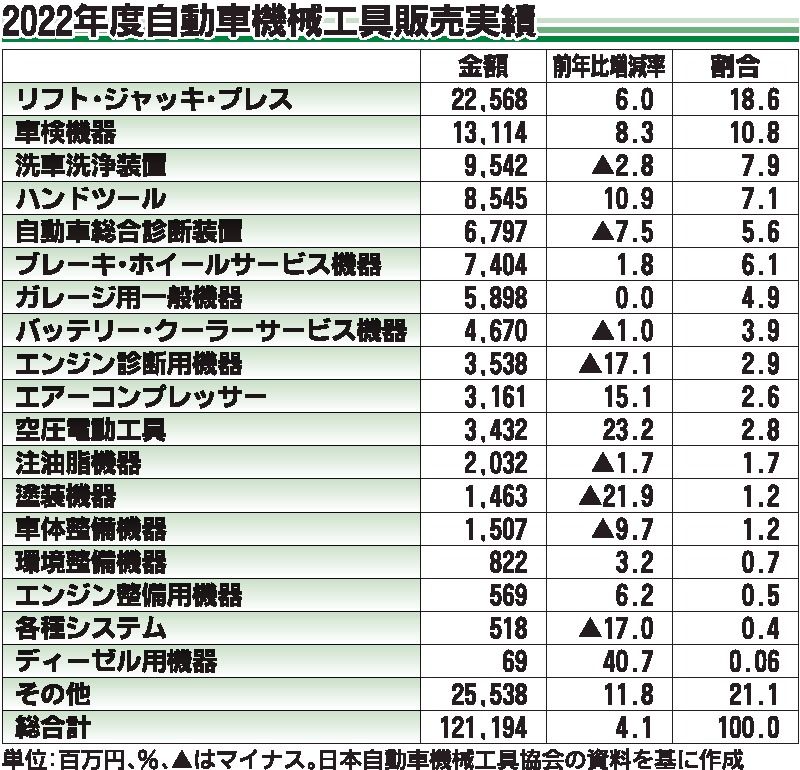 日本自動車機械工具協会(機工協、柳田昌宏会長)がまとめた2022年度「自動車機械工具販売実績」によると、商品カテゴリー19項目中11項目で前年実績を上回った。このうち、車検機器とリフト・ジャッキ・プレス、エアーコンプレッサーが、過去17年...