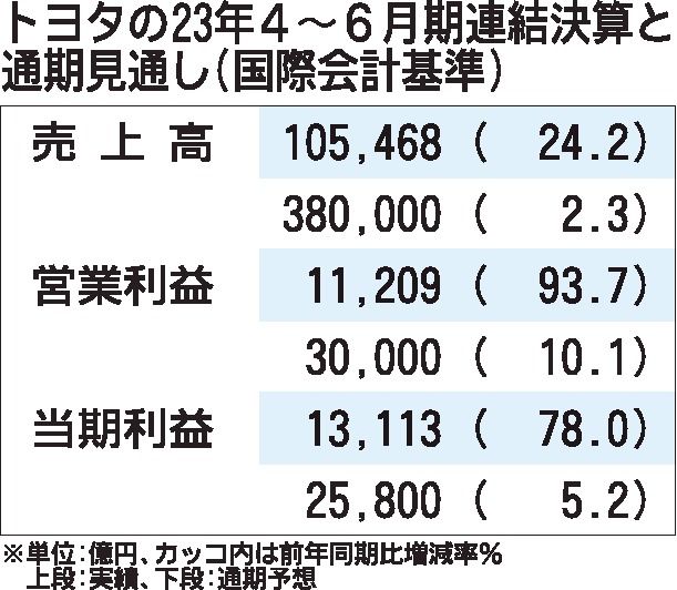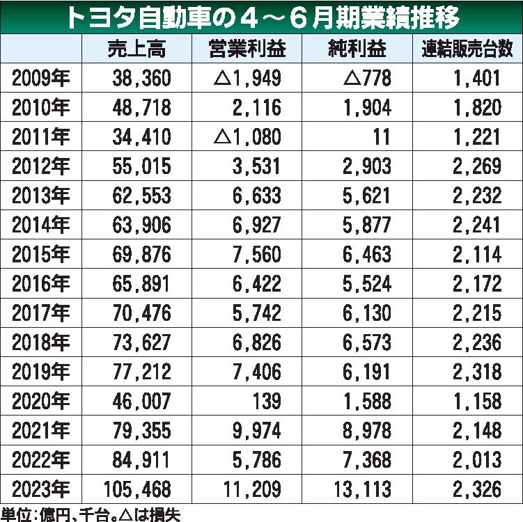 トヨタ自動車が1日発表した2023年4~6月期連結決算(国際会計基準、IFRS)は、売上高に相当する営業収益が10兆円、営業と最終利益がともに1兆円の大台を超え、4~6月期として過去最高だった。連結販売台数が過去最高となり、円安も収益を押...