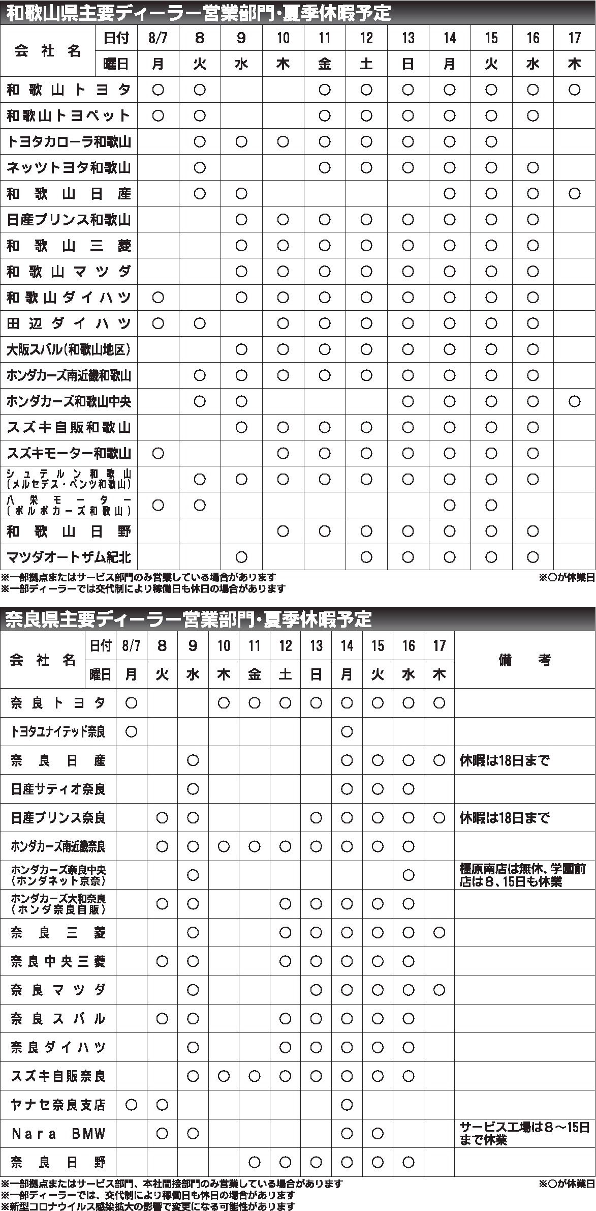 〈近畿地区主要ディーラー営業部門・夏季休暇予定〉和歌山県/奈良県 2023/8/7~17