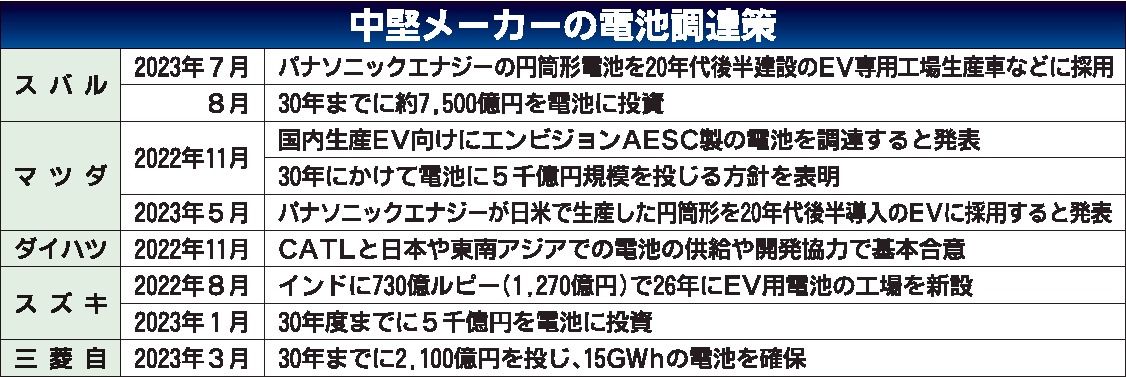 スバル、スズキなど国内中堅メーカーが車載電池の調達に本腰を入れている。スバルは、マツダに続いてパナソニックエナジーから車載用円筒形リチウムイオン電池の供給を受ける方向で検討に入った。両社は当初、資本提携先のトヨタ自動車を通じて車載電池を調...