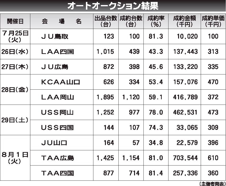 〈オートオークション結果〉中四国地区 2023/7/25~8/1