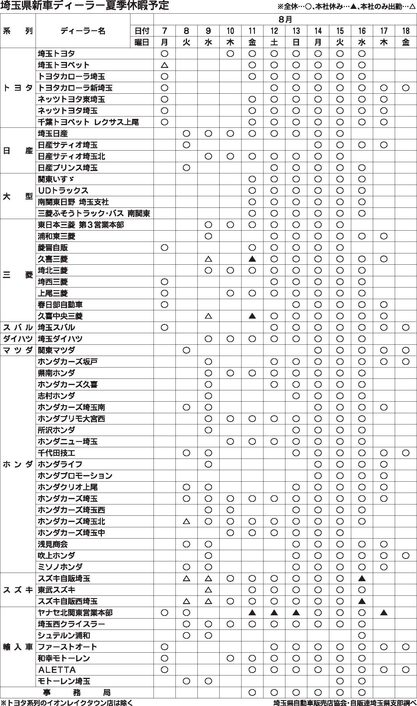 〈埼玉県新車ディーラー夏期休暇予定〉2023/8/7~18
