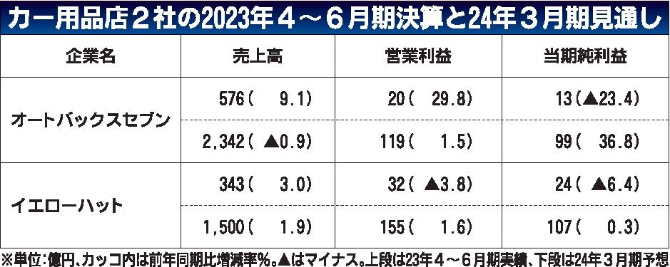 上場カー用品店2社の2023年4~6月期の連結決算は、そろって増収となった。新車供給の回復が不十分なため、既販車向けのメンテナンス需要が堅調に推移。オートバックスセブンは3年連続、イエローハットは2年ぶりに売上高が前年同期を上回った。オー...