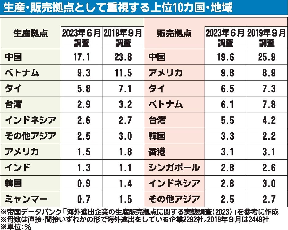 帝国データバンクは「海外進出企業の生産・販売拠点に関する実態調査2023」をまとめた。生産・販売ともに「中国」が進出先首位だが、2019年9月の前回調査と比べると中国の重要度は低下した。同社は「ポストコロナ時代では、中国を最重要拠点と認識...