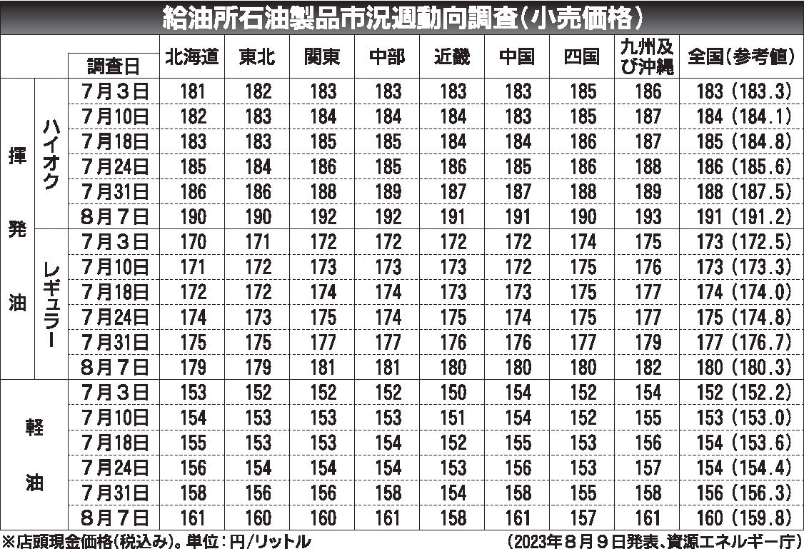 〈給油所石油製品市況動向調査(小売価格)〉2023/7/3~8/7