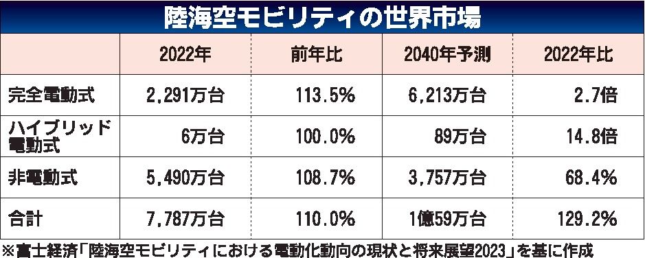 富士経済(菊地弘幸社長、東京都中央区)は「陸海空モビリティにおける電動化動向の現状と将来展望2023」をまとめた。2022年は「非電動式モビリティ」が約7割を占めたが、40年には電動式モビリティが約6割に達すると予測した。同社は「カーボン...