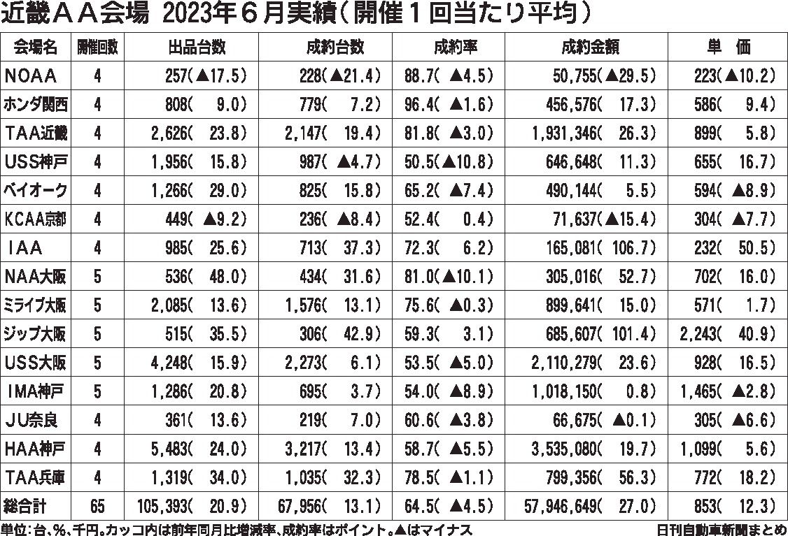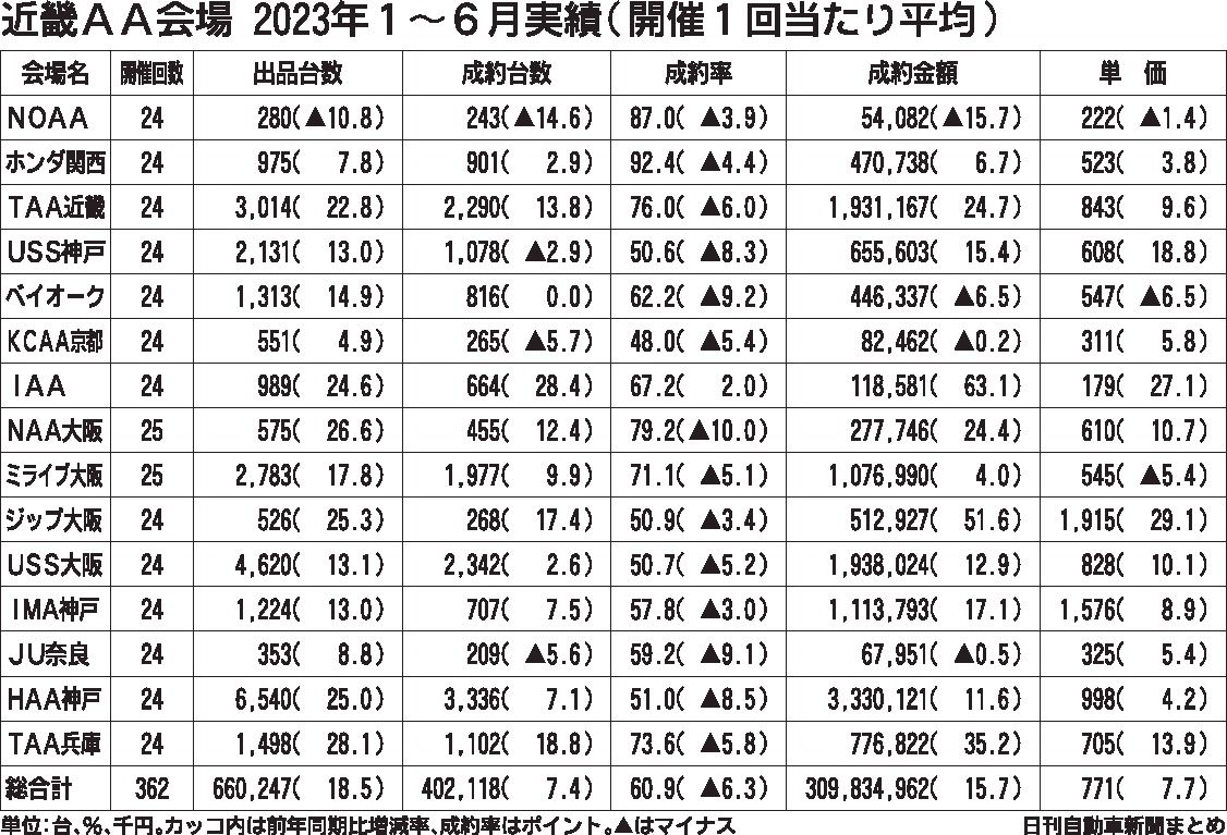 近畿地区の中古車オークション(AA)15会場の2023年上期(1~6月)実績は、出品台数が前年同期比18・5%増の66万247台と前年から10万台以上伸長した。新車の生産回復に伴って供給不足が解消に向かい、下取り車の流通量が増加したことが...