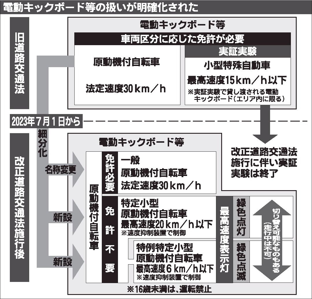 Q 改正道路交通法の施行で、7月から電動キックボードの交通ルールが変わったね A 6月30日まで電動キックボードやペダル付電動バイクなどは、原動機付自転車(法定速度時速30㌔㍍)や、実証実験を行うために特例措置を適用した小型特殊自動車(同...