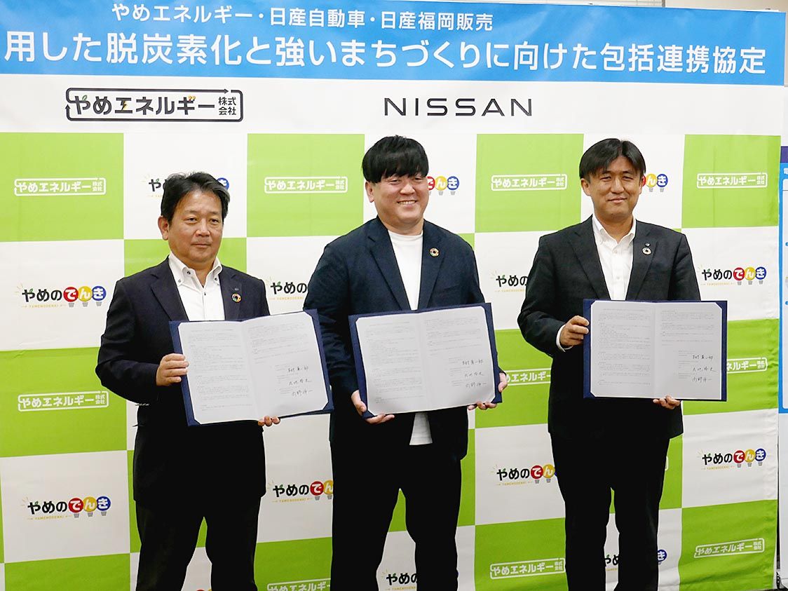 日産自動車と日産福岡(内野伸一社長)、やめエネルギー(本村勇一郎社長、八女市)は、八女市と広川町を中心に、電気自動車(EV)の普及を通じた脱炭素化および強いまちづくりに向け、包括連携協定を結んだ。日産自動車と新電力会社とのEVを活用した連...