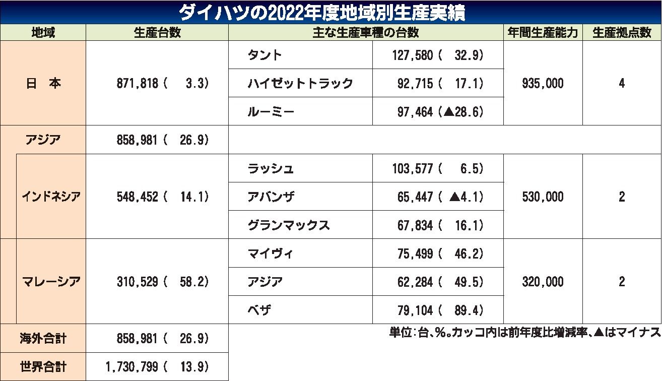 2022年度は過去最高の173万799台(前期比13・9%増)を生産したダイハツ工業。国内はコロナ禍の稼働調整を強いられたが、インドネシアとマレーシアの好調な生産がけん引した。23年4~6月は仕入れ先火災の影響を受けて一部の国内工場の稼働...