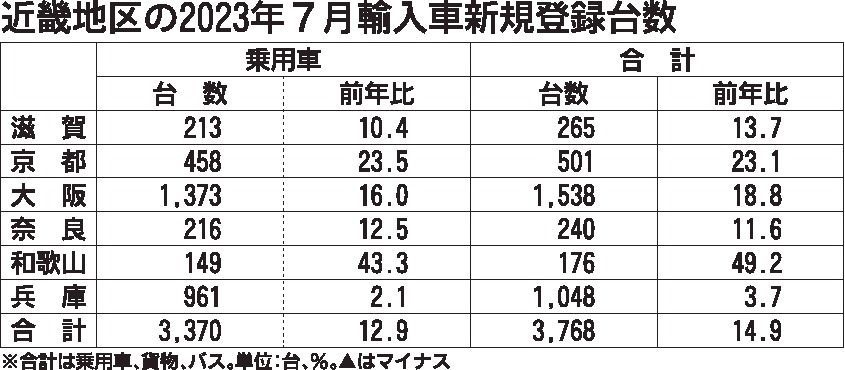日本自動車輸入組合(JAIA)の発表によると、7月の近畿地区の輸入車新規登録台数(外国メーカー車と日本メーカー車)は前年同月比14・9%増の3768台と、3カ月連続で前年を上回った。大幅減だった前年の反動や生産台数の回復に伴う車両供給量の...