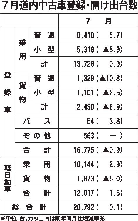 7月の道内中古車登録・届け出台数は、前年同月比0・1%増の2万8792台となり、3カ月連続でプラスとなった。新車販売の回復に伴い、下取り車の発生量が増加したことなどが要因。軽自動車が3カ月連続で増加した。 日本自動車販売協会連合会がまとめ...