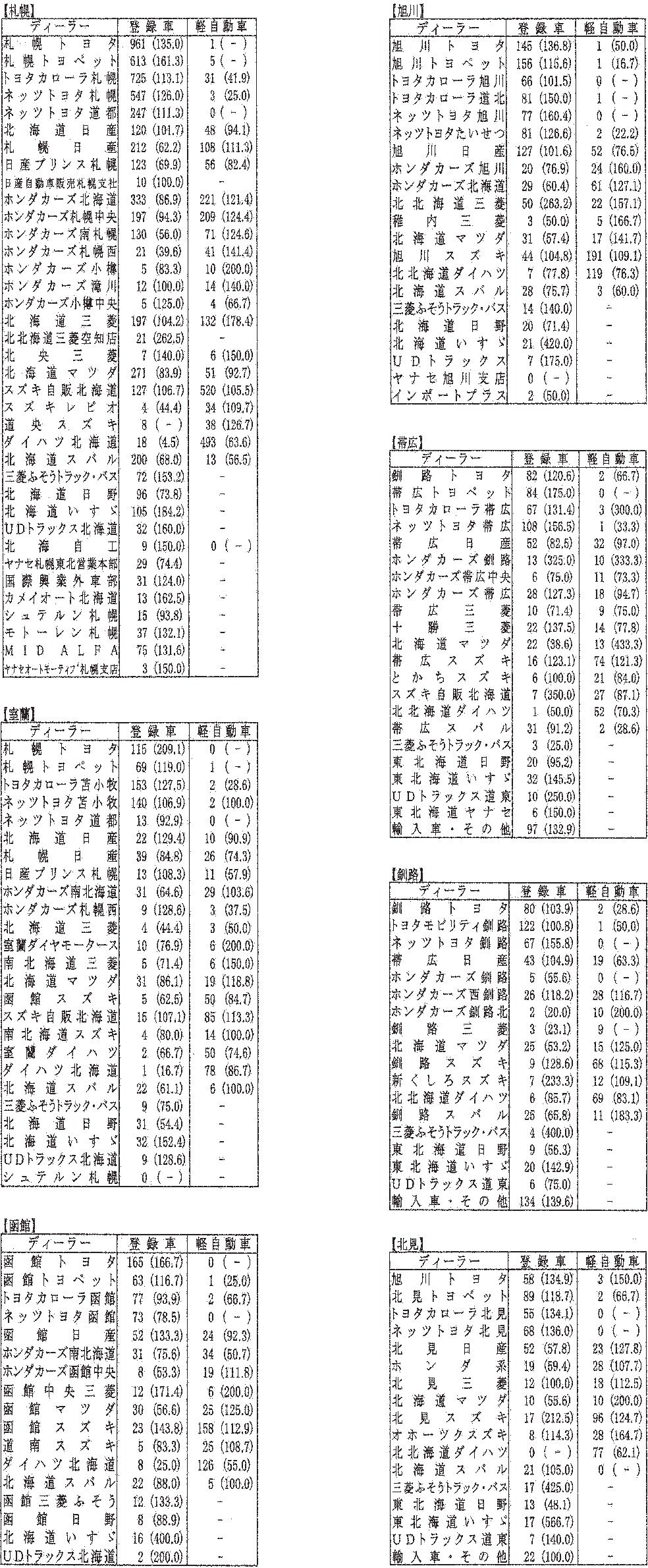 〈7月度全道管内別ディーラー別新車登録・届け出台数〉(カッコ内は前年同月比)※札幌管内ホンダ系・スズキ系の登録台数は自販連正会員分