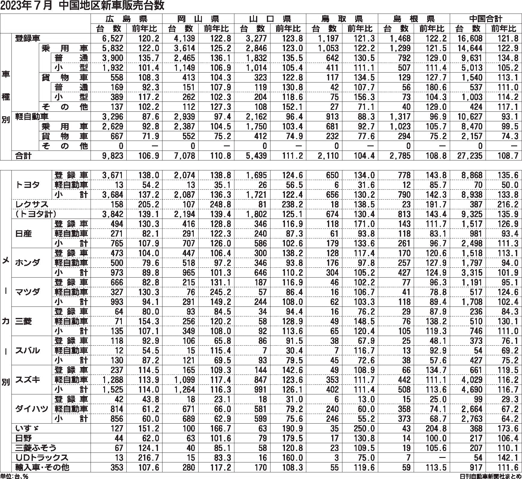 2023年7月の新車販売台数(登録車と軽自動車の合計)は、前年同月比8・7%増の2万7235台となり、11カ月連続で前年台数を上回った。伸長率で全国平均を0・2㌽上回ったほか、全県が前年越えとなり、広島、島根、鳥取は11カ月連続、岡山と山...