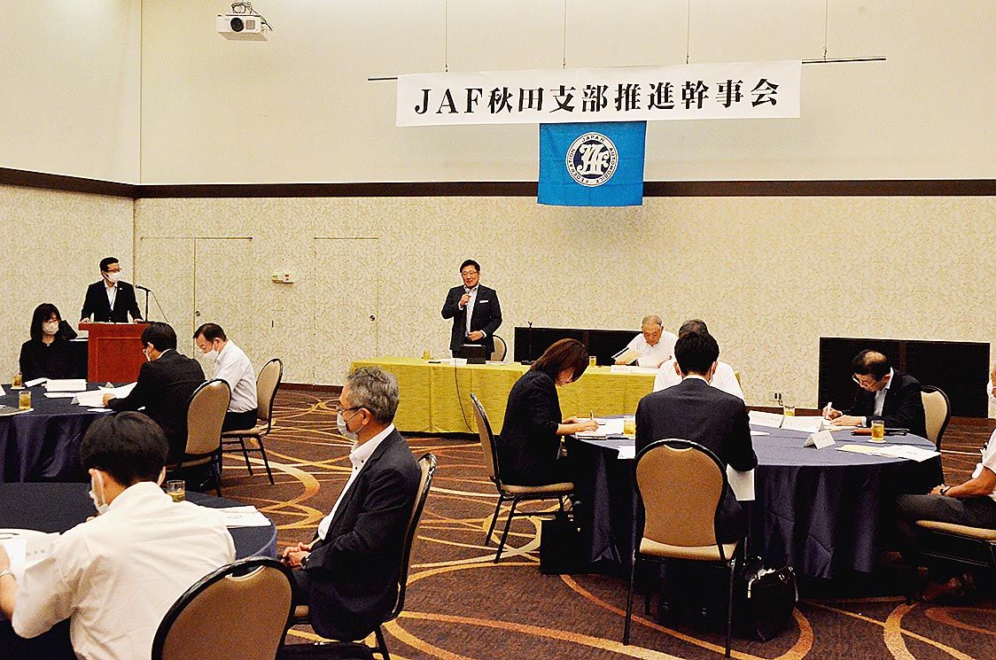 【秋田】日本自動車連盟(JAF)秋田支部(伊藤哲充支部長)は、秋田市で「第112回推進幹事会」を開催した=写真。直近の実績や各社の取り組みを確認したほか、グループディスカッションを行い、県内で発生した水害について課題を共有した。 県内の会...