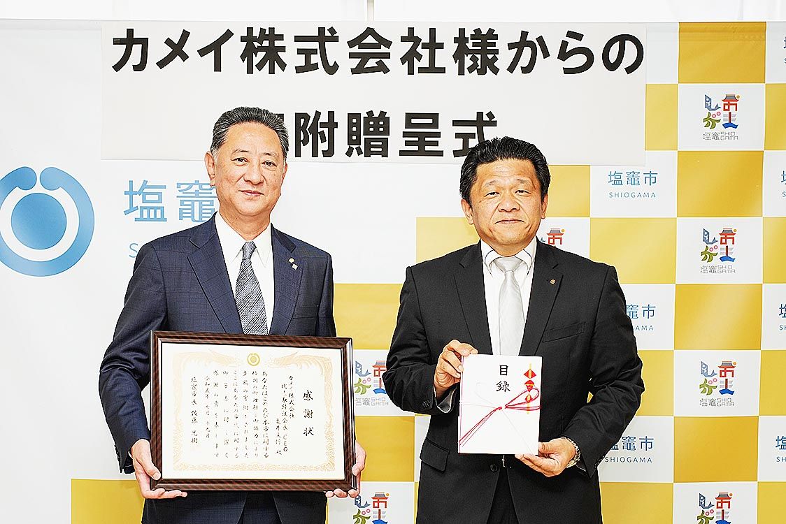 【仙台】カメイ(亀井昭男社長)は、創業120周年を記念して創業の地である塩竈市に寄付金として1億2千万円を寄贈した。同社の亀井文行会長が市役所を訪れ、佐藤市長に目録を手渡した=写真。 同社は1903年に亀井文平氏が石油や砂糖などを販売する...