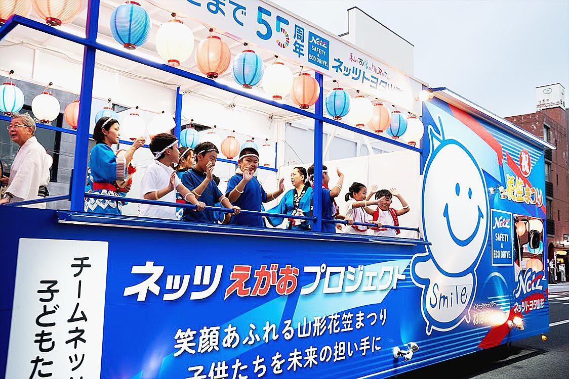 【山形】ネッツトヨタ山形(髙橋修社長)は、今年で61回を迎えた「花笠まつり」で、一般の子どもたちを対象にした「ネッツの山車に乗ってみよう」企画を初めて実施した=写真。子どもたちは初めての体験に山車の上で楽しい時間を過ごした。 山形の伝統文...
