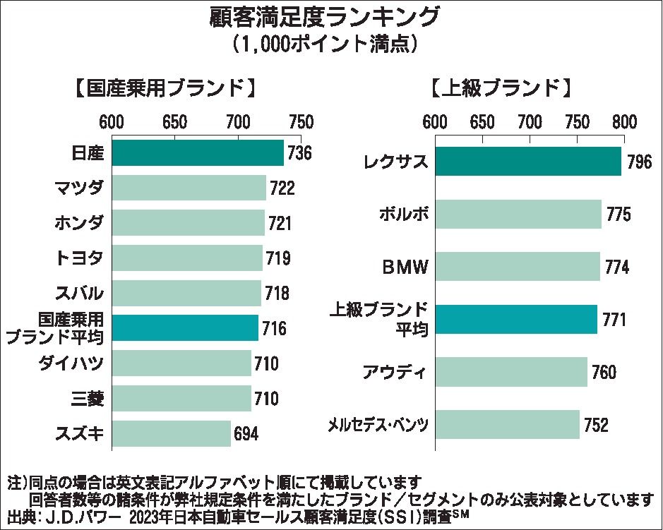 JDパワージャパン(山本浩二社長、東京都港区)が24日発表した「2023年日本自動車セールス顧客満足度調査」によると、国産ブランドで日産自動車が、輸入車を含む上級ブランドでレクサスが1位となった。いずれも3年連続で首位。一方、総合満足度の調査平均スコア(1千ポイント満点)は、前年比13ポイント減の720ポイントに低下。セグメント別ではともに同14ポイント減少し、国産ブランドが716ポイントに、上級ブランドが771ポイントに低下した。新車の供給遅れから、納期に不満を持つ顧客が全体的に多かったことなどが要因の一つとみられる。