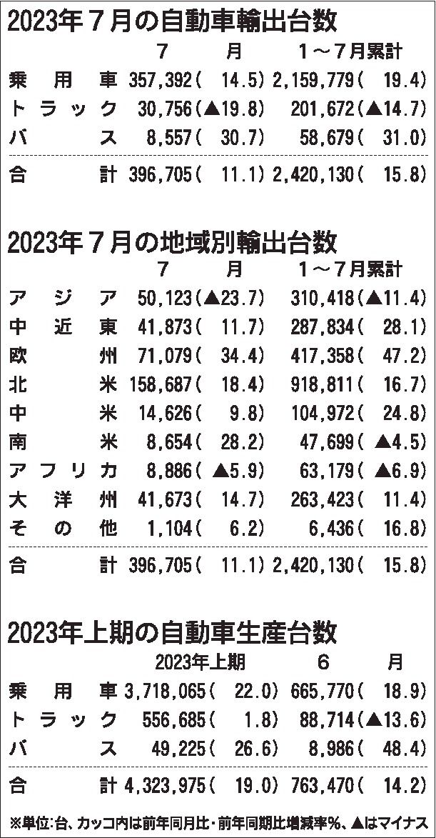 一方、7月の自動車輸出台数は、39万6705台(同11.1%増)となり6カ月連続で増えた。仕向け地別では、北米(同18.4%増)をはじめ多くの主要地域で前年同月を上回った。欧州(同34.4%増)は、6月(同57.8増)の伸び率に比べ落ち着いた。アジア(同23.7%減)とアフリカ(同5.9%減)は前年を下回った。