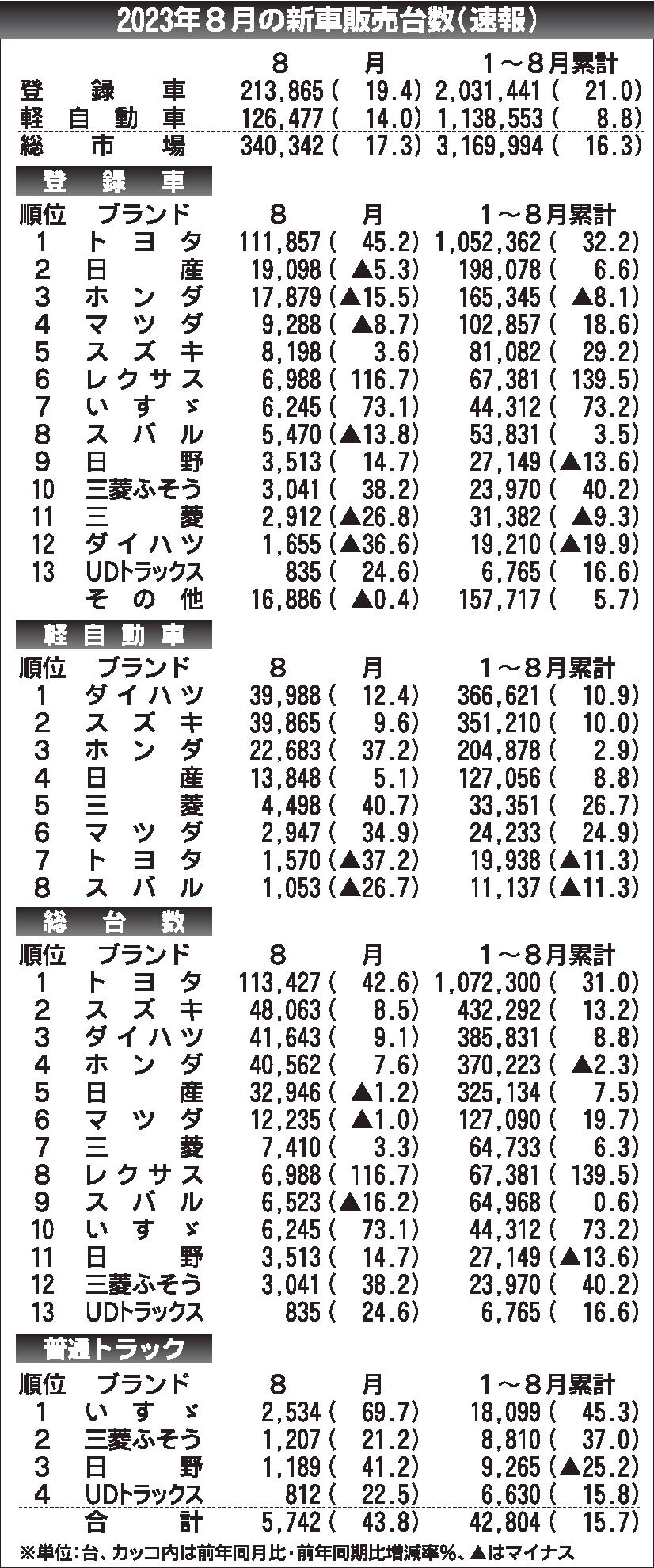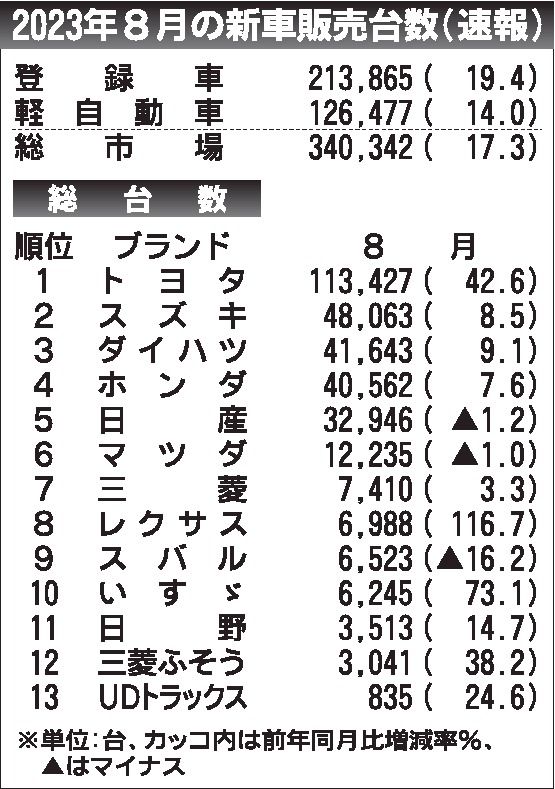 2023年8月の国内新車販売台数(登録車と軽自動車の合計)は前年同月比17・3%増の34万342台で、12カ月連続のプラスとなった。軽販売が2カ月ぶりに前年実績を超え、2カ月ぶりに2桁増となった。 7月実績(前年同月比8・5%増)が今年に...
