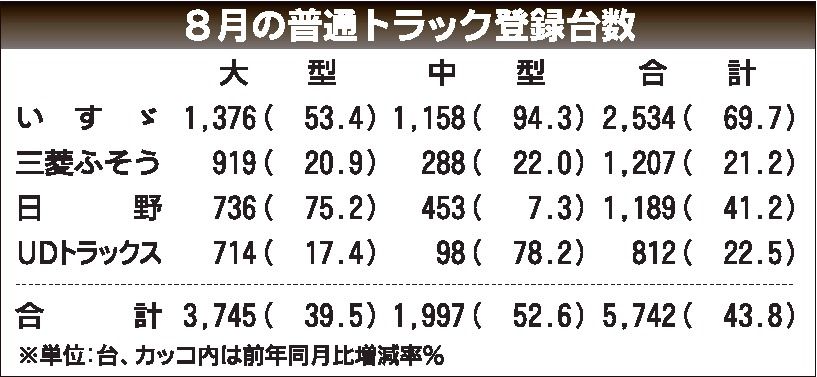 業界筋がまとめた8月の普通トラック(積載量4トン級以上、中・大型トラックの合計)の新車販売台数は、前年同月比43・8%増の5742台となり、6カ月連続で増加した。半導体や部品の調達難が緩和し、全メーカーの販売が2桁以上、伸びた。いすゞ自動...