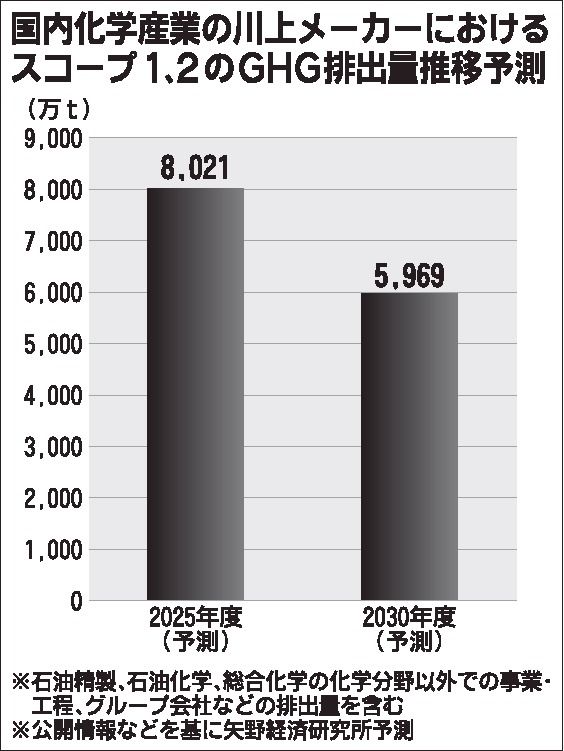 矢野経済研究所(水越孝社長、東京都中野区)は、化学産業のカーボンニュートラル(温室効果ガス排出実質ゼロ)動向調査を実施した。2025年度の石油精製、石油化学、総合化学メーカーなどの国内化学産業におけるスコープ1(自社排出)とスコープ2(間...