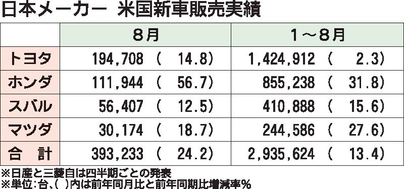 日本の自動車メーカー4社の8月の米国新車販売は前年同月比24・2%増の39万3233台となり、6カ月連続で増加した。半導体不足の緩和で新車供給量が安定してきた。米国市場ではローン金利上昇の影響が懸念されてきたが、今のところ需要は底堅く、4...