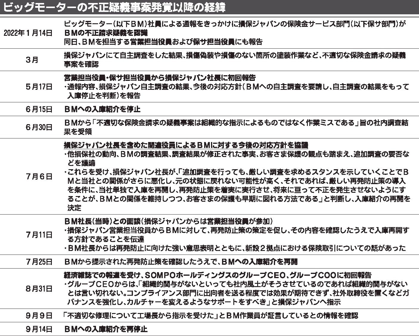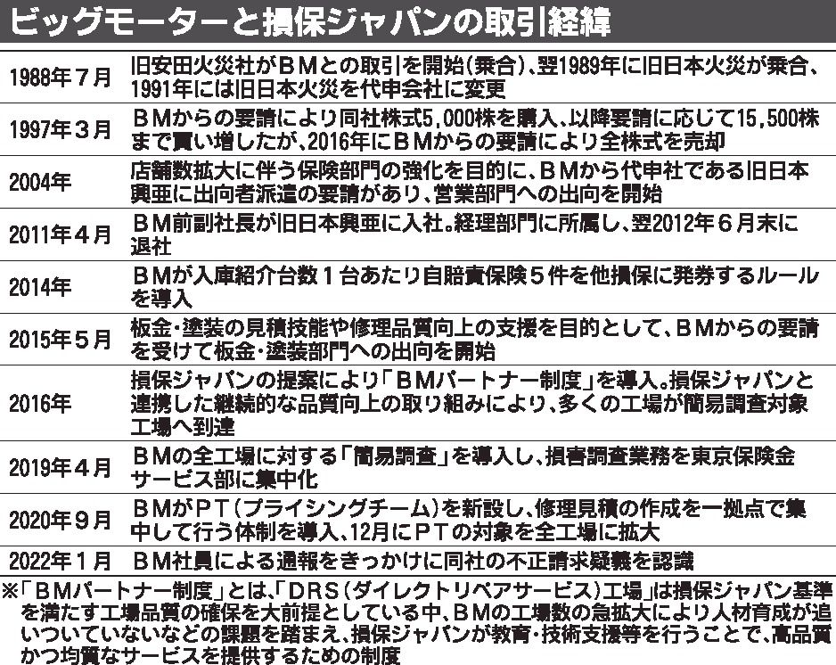 ビッグモーター(和泉伸二社長、東京都港区)による自動車保険金の不正請求問題で、「大きな経営判断ミスをした」として損害保険ジャパンの白川儀一社長が引責辞任を表明した。ただ、外部弁護士による調査委員会の調査は続いている。保険請求の手続きが簡素...
