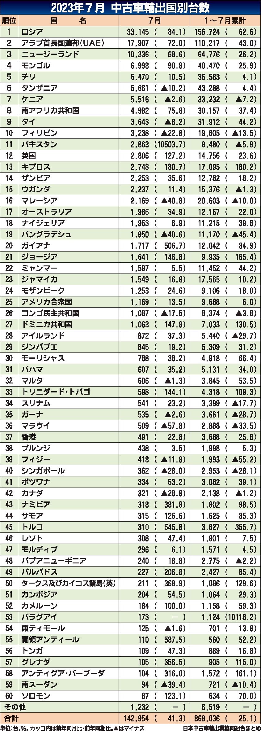 日本中古車輸出業協同組合(JUMVEA)がまとめた2023年7月の中古車輸出台数(車両価格20万円以上)は、前年同月比41・3%増の14万2954台と10カ月連続で増加した。 仕向け地別では、ロシアが前年同月より84・1%増の大幅伸長を記...