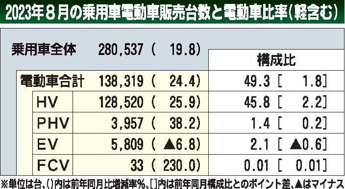 2023年8月の国内電動車販売、24.4%増で12カ月連続プラス 電動車比率は49.3%