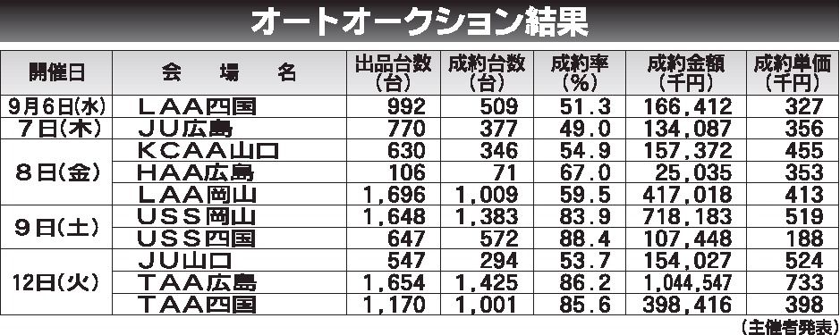 〈オートオークション結果〉中国・四国地区 2023/9/6~12