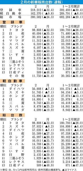 2月の新車販売台数は登録車と軽自動車の合計で前年比24.3%減の38万582台と大きく落ち込み、7カ月連続の前年割れとなった。登録車が35年ぶりの低水準になり、すべての月を通じて過去4番目に大きい下落率になったほか、軽自動車も2けた近い減...