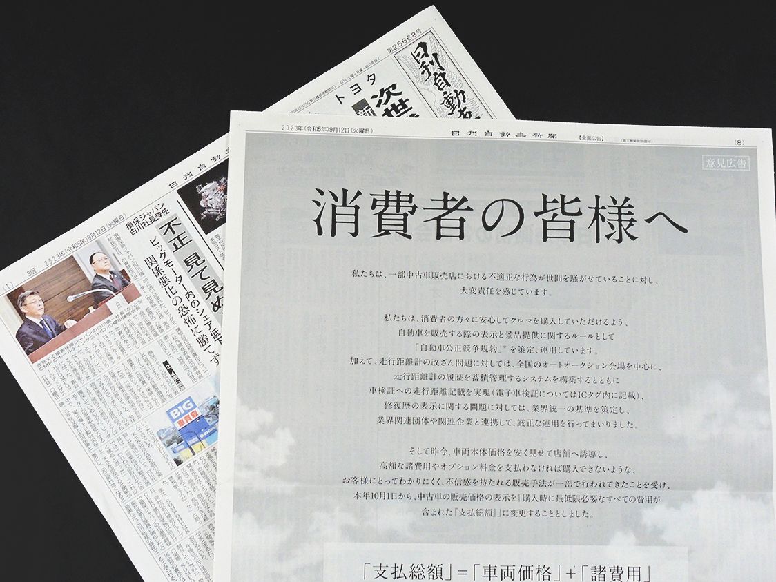 日本中古自動車販売協会連合会(JU中販連、海津博会長)と自動車公正取引協議会(倉石誠司会長)は、「消費者の皆様へ」とタイトル付けした意見広告を本紙に掲載した。 広告には、10月1日から中古車の販売価格表示が「支払総額」への変更が義務付けら...