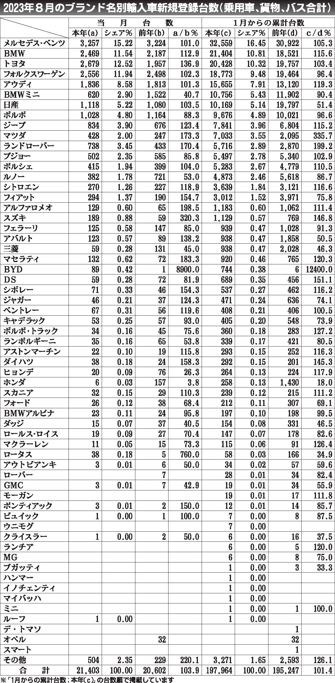 〈2023年8月のブランド別輸入車新規登録台数(乗用車、貨物、バス合計)〉