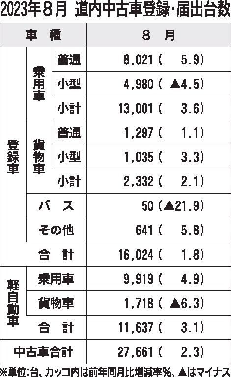 8月の道内中古車登録・届出台数は、前年同月比2・3%増の2万7661台で、4カ月連続でプラスとなった。新車の供給量が回復基調にあり、下取り車の発生量増などが要因。登録車、届け出ともに前年実績を上回った。 日本自動車販売協会連合会のまとめに...