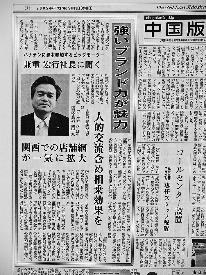 日刊自動車新聞は、ビッグモーター前社長の兼重宏行氏のインタビュー記事を2005年5月19日付の中国版に掲載していた。関西圏で有名だった中古車販売会社に資本参加した直後で、業界の注目を集めていた。兼重氏が登場した記事は、ほかのマスコミも含めてほとんどない。記事は以下の通り(原文ママ)。