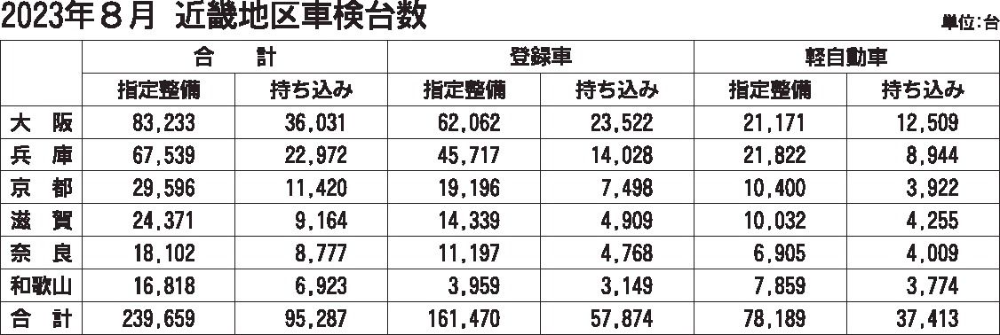 近畿2府4県の8月の継続検査(車検)台数(軽自動車を含む)は、前年同月比3・3%減の33万4946台で、2カ月ぶりに前年を下回った。登録車は同4・1%減の21万9344台で2カ月ぶりのマイナス、軽は同1・8%減の11万5602台で8カ月ぶ...