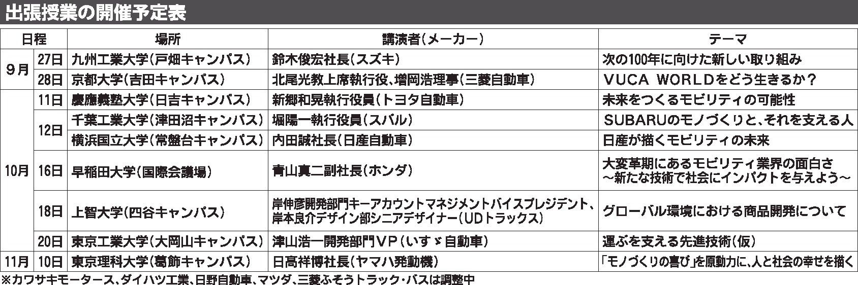 九州工業大学の戸畑キャンパスで27日に実施するスズキの鈴木俊宏社長の講演を皮切りに、各地の大学で展開する。各社の経営幹部が登壇し、自動車業界の変革期と言われる中での取り組みやモビリティ業界の未来などについて話し、学生からの質問にも答える。