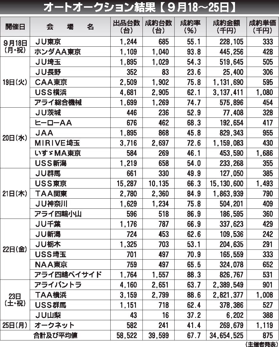 〈オートオークション結果〉首都圏 2023/9/18~25