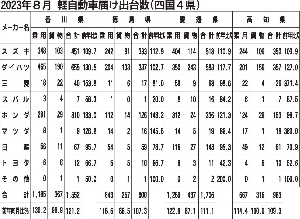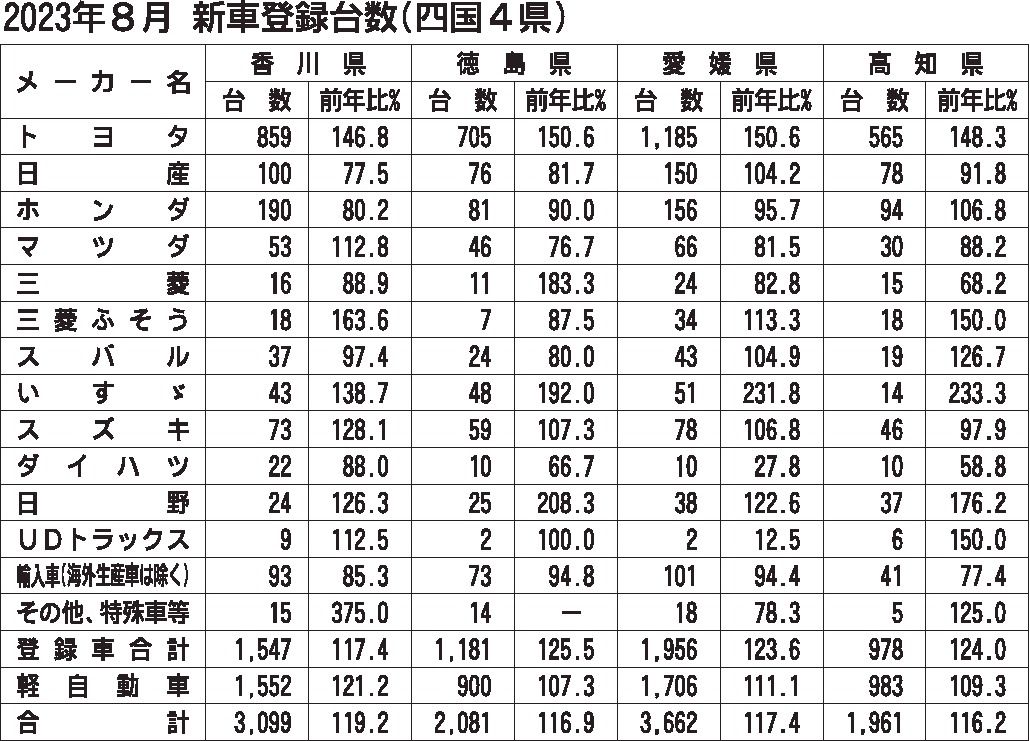 8月の四国新車 12カ月連続の増加 軽はプラスに転じる