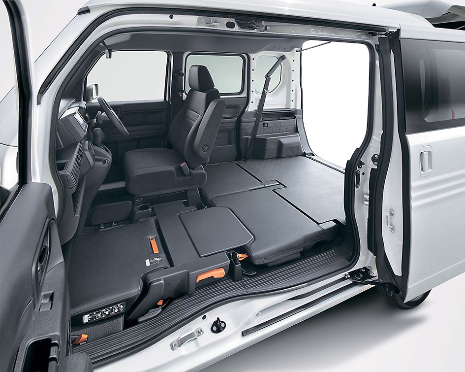 助手席のセンターピラー(柱)をなくすことで荷物の積み降ろしをしやすくしたほか、荷崩れを防ぐため軽商用バンで初めて電動サーボブレーキを採用した。安全面では軽商用バンとして初めてサイドカーテンエアバッグを運転席と助手席に標準装備した。
