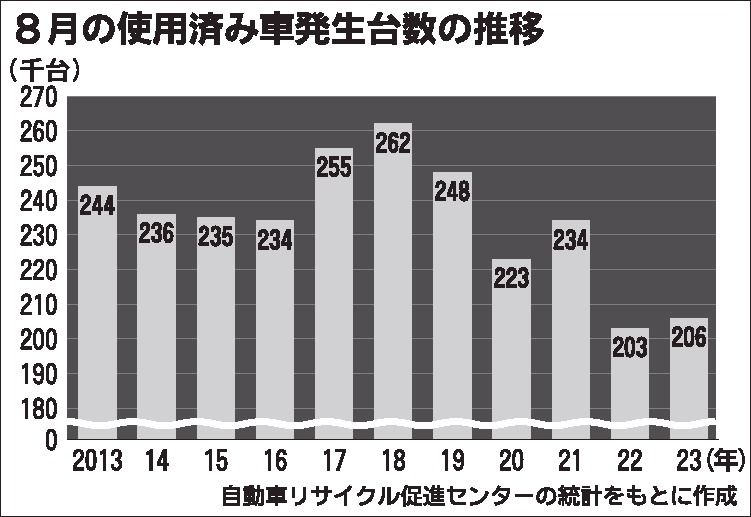 自動車リサイクル業界の景気を左右する使用済み自動車の発生台数が、緩やかな回復を見せている。自動車リサイクル促進センター(JARC)が公表した2023年8月の使用済み車国内発生台数は前年同月比約1・2%増の約20万6千台で、2021年9月以...