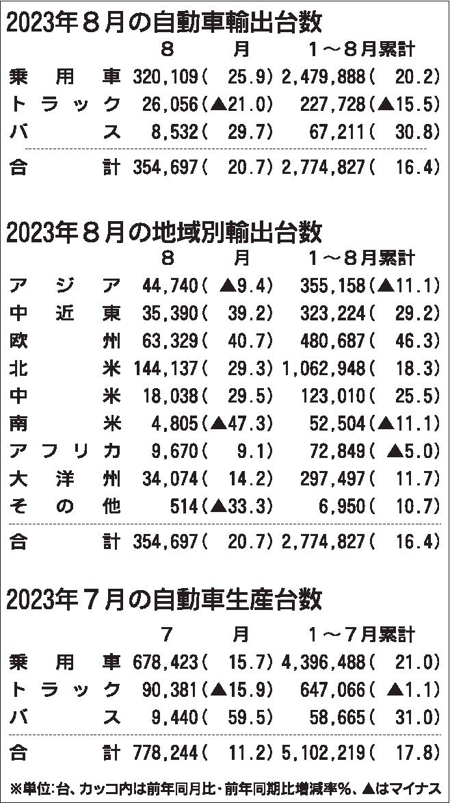 日本自動車工業会(豊田章男会長)がまとめた8月の輸出実績は前年同月比20.7%増の35万4697台だった。内訳は乗用車が32万109台(同25.9%増)、バスが8532台(同29.7%増)、トラックは同21.0%減の2万6056台だった。