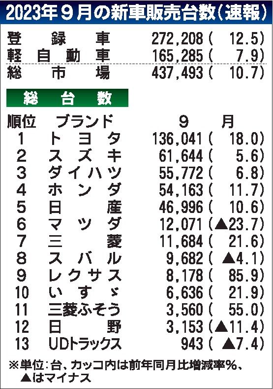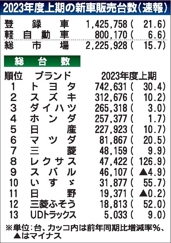 2023年度上期(4~9月)の国内新車販売台数(登録車と軽自動車の合計)は2年ぶりの前年超えとなる222万5928台(前年同期比15・7%増)だった。2桁増は前年実績の反動が主な原因で、コロナ禍前の実績を1割以上、下回る。下期は各社の新型...