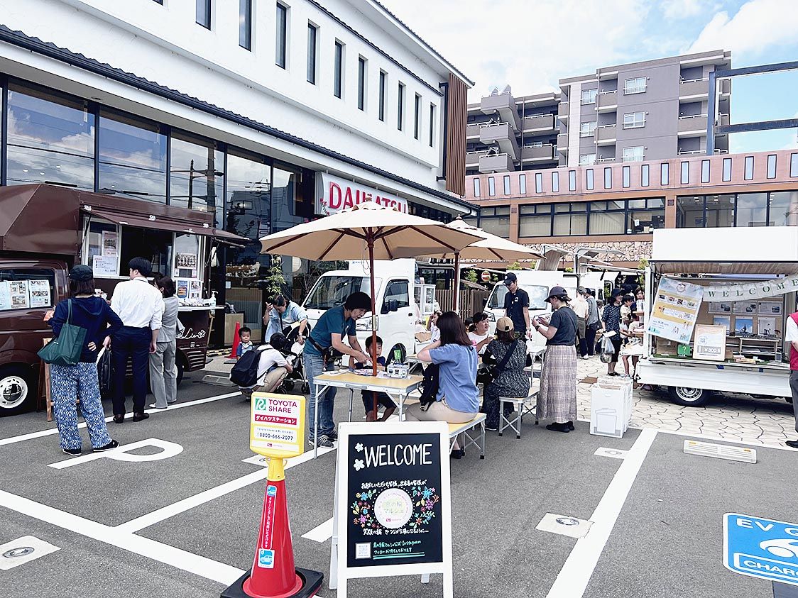 【京都】京都ダイハツ(有江真也社長)は、本社(京都市右京区)で移動販売車「ニバコ」を活用した「京の輪マルシェ」を開催した=写真。今回が7回目の実施となり、同社の位置する右京区にちなんで、5つの事業者全てが同区から出展した。来場者数は過去最...