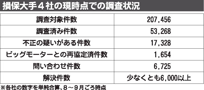 ビッグモーター(和泉伸二社長、東京都多摩市)の自動車保険金の不正請求問題で、損害保険大手4社の調査対象が約21万件弱で、このうち4分の1の調査が終わったことが分かった。調査を終えた件数のうち、3割超に不正の疑いがあるという。損保各社とも保...