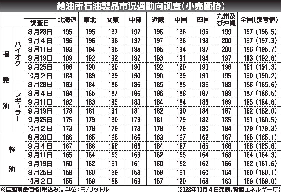 〈給油所石油製品市況週動向調査(小売価格)〉2023/8/28~10/2