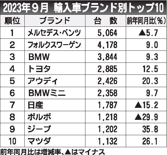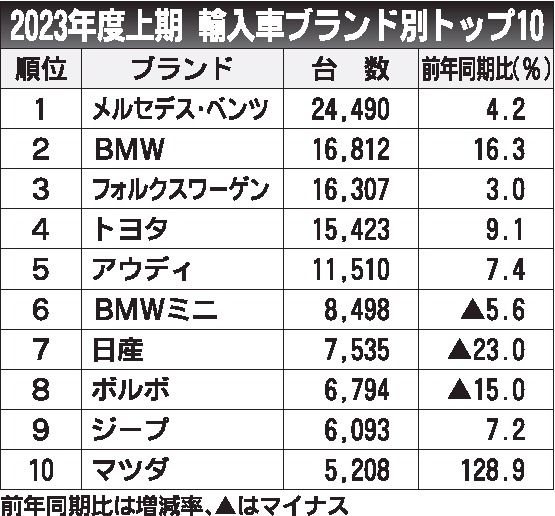 乗用車のブランド別では、メルセデス・ベンツが同4.3%増の2万4483台で最多。BMWが同16.3%増の1万6812台、フォルクスワーゲン(VW)が同2.9%増の1万6305台と続いた。